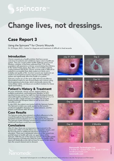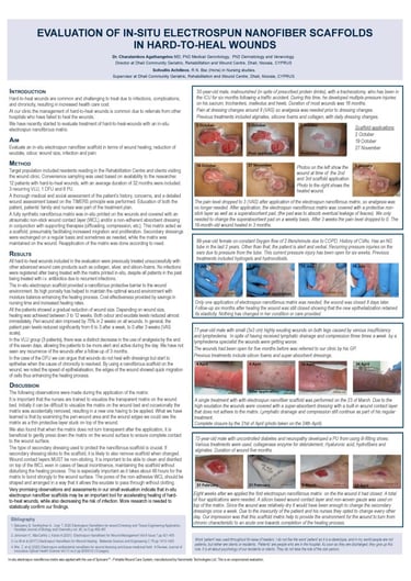 Chronic wounds, a significant and growing healthcare concern, affect a large segment of the population and pose daunting treatment challenges. The introduction of advanced wound care technologies like SpincareTM and in-situ electrospun nanofiber scaffolds represents a groundbreaking development in addressing these persistent and hard-to-heal wounds. Chronic wounds, including venous leg ulcers, diabetic foot ulcers, and pressure ulcers, often resist conventional treatments, necessitating innovative approaches. The Spincare system leverages electrospinning technology to create a tailored nanofibrous matrix that conforms precisely to each wound’s unique contours. This method has shown remarkable efficacy in treating various chronic wounds, transforming wound management by providing a 3D matrix that facilitates cell proliferation and cell migration, as well as pain reduction.