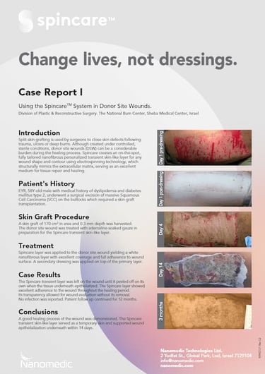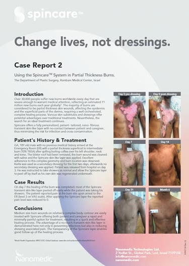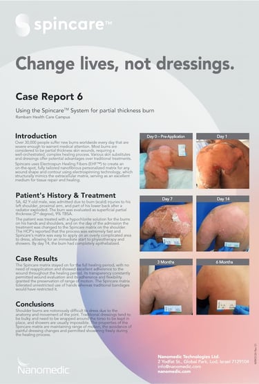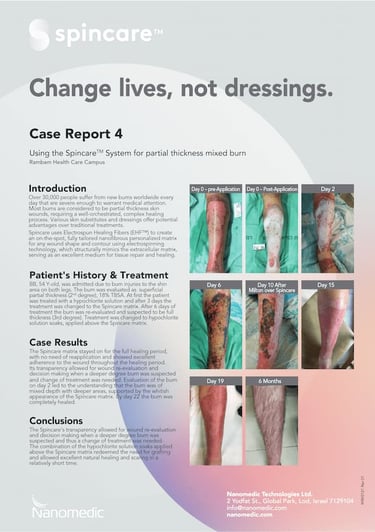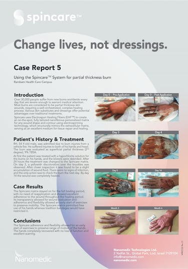 At Rambam Medical Center in Israel, the Spincare System is revolutionizing the treatment of partial-thickness burns. Utilizing cutting-edge Electrospun Healing Fibers (EHF) technology, Spincare creates a temporary nanofibrous, personalized skin-like matrix (alloplastic) directly on the wound, closely resembling the extracellular matrix to promote quick and effective healing. This innovative technology has demonstrated exceptional outcomes in various burn cases: